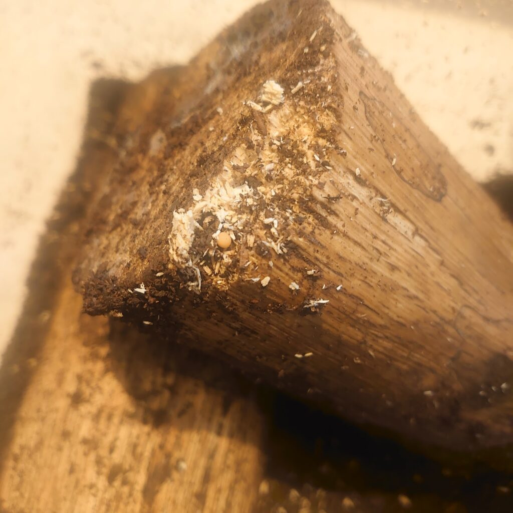 青カビが発生していないか確認のため、のぞいたら齧ってました。木屑を取り除いていくと卵を発見。